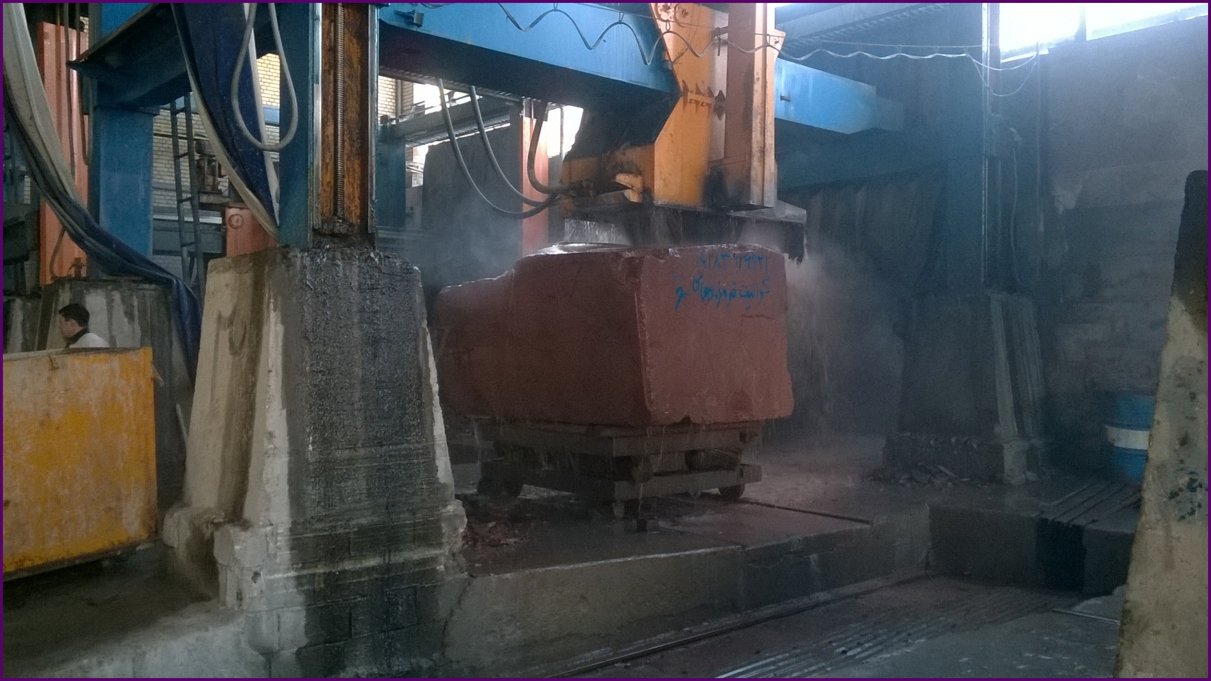 After cutting blocks, large plates are longitudinally cut into plates with identical thickness. In transverse cutting stage, polished plates are cut into desired width according to the size of final product, by different disc mills. In larger factories, bridge cutters which use a 50-60 Cm disc, are more prevalent. About 10 plates are placed over each other, and then after adjusting machine, cutting process starts. Sometime there are also a Squaring machine with 30-40 Cm blades beside bridge cutter. There are totally 2 procedures for transverse cutting, parallel discs and single disc methods. The former has better precision while the latter possess higher production capacity. There are some technical point that should be noted during transvers and longitudinal cutting: