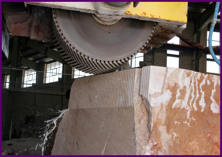 Block cutters have circular blades (discs) with adamantine segments. Diameter of the discs are in range of 15 to 300 Cm. In this method, block is cut by one or more parallel discs simultaneously and the cutting process may be done in one stage or more stages. The one stage method is useful for soft and semi-hard stones, but multistgae method is used for hard stones. Only 20% of disc’s diameter may go deep in the stone, so as the cutting dimension increases, diameter of the discs must increase much more. So this machine is not suitable for high production.